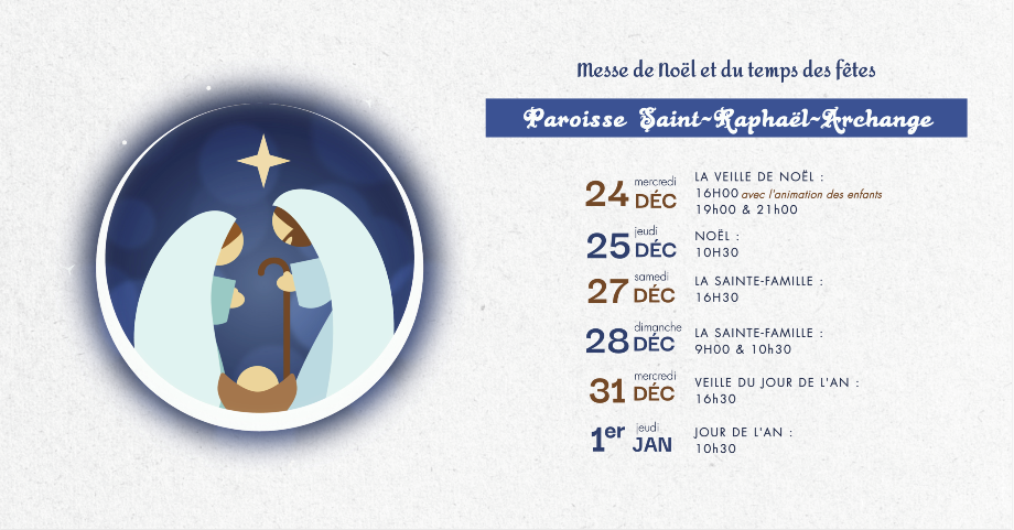 Nous reprenons cette année une exposition de crèches, mais cette fois pendant toute la période des fêtes. Si vous avez une crèche à nous prêter entre le 8 décembre pour l’installation de l’exposition jusqu’au 5 janvier, veuillez nous l’apporter au presbytère ou aux messes. Bien identifier votre crèche et si vous connaissez sa provenance nous en faire part. Nous aurons aussi besoin de bénévoles pour accueillir les visiteurs. L’exposition se tiendra au 2e étage du presbytère, les samedis entre 13h et 16h et les dimanches entre 11h30 et 14h.